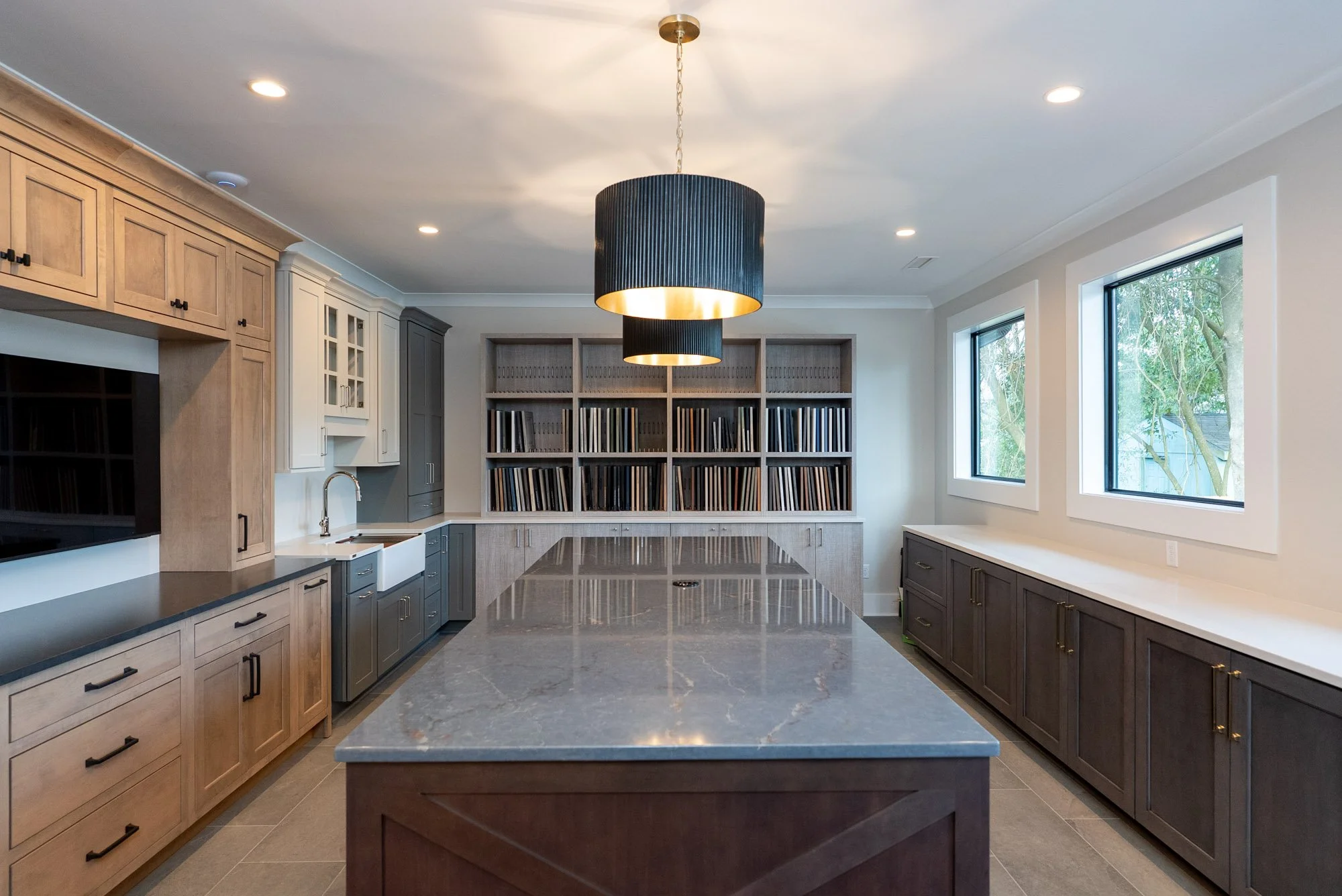 In our selection center, you will find our island workspace. This is where conversations begin and ideas take shape. The spacious island creates a comfortable, approachable setting that feels more like a home than a showroom. It allows us to review selections together while keeping the process relaxed and engaging.